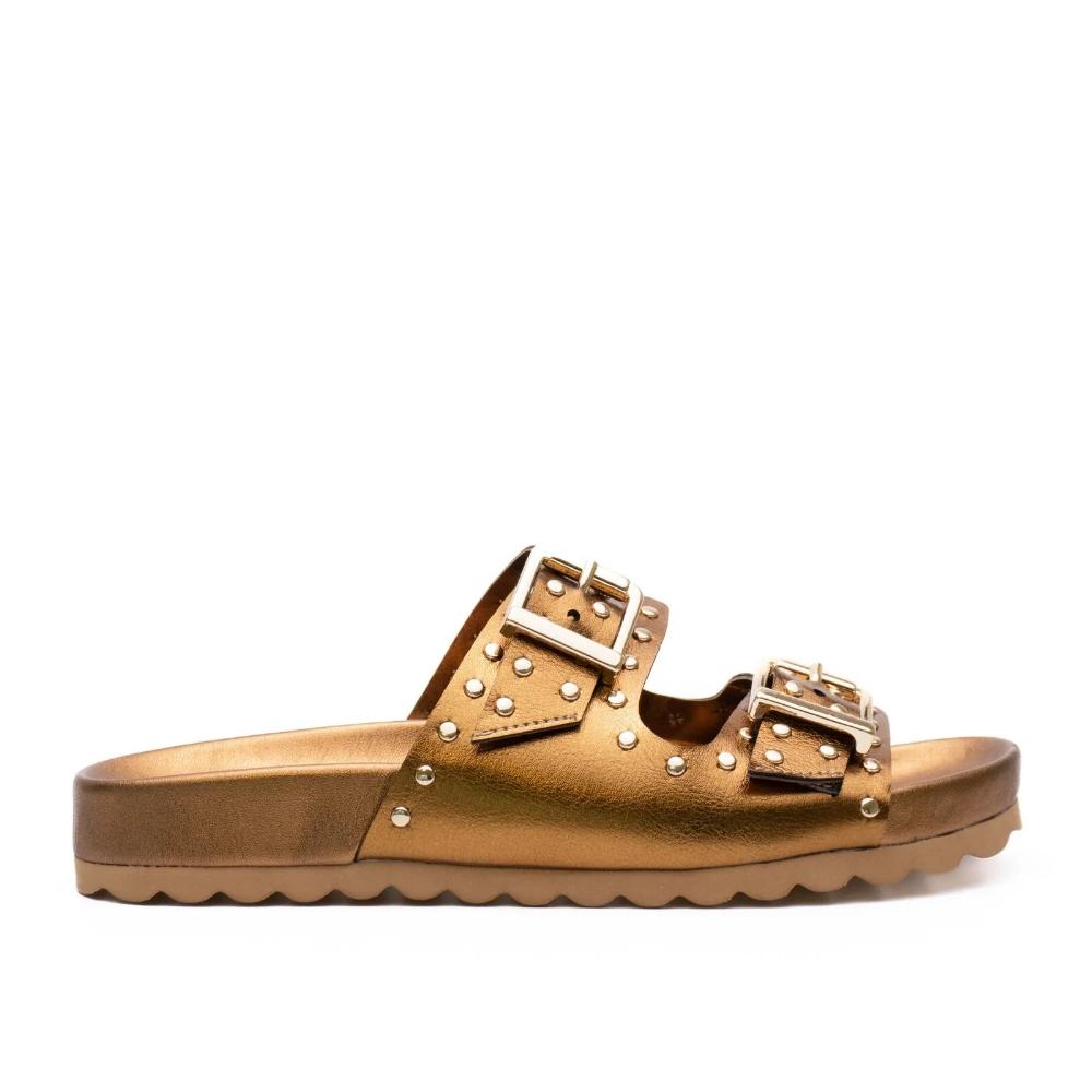 A Papete Bronze Vanucia traz conforto com sua palmilha anatômica e estilo único com tiras largas, fivelas metálicas e detalhes metálicos. Perfeita para qualquer ocasião. Compre agora!
