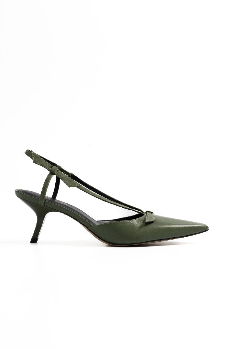 Slingback Vanucia em Verde Oliva com Detalhe de Laço e Salto Vírgula